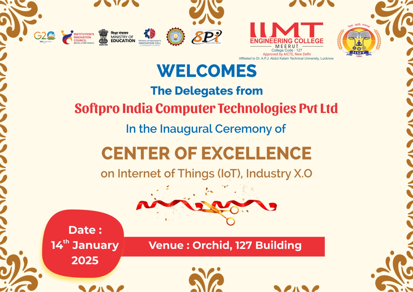 Today, on Tuesday, 14/01/2025, an MoU was signed between Softpro India Computer Technologies Private Limited at IIMT Engineering College. Softpro India Computer Technologies Private Limited also established the Center of Excellence of IoT Industry Group in IIMT Engineering College. On this occasion, the Chairman of the college, Mr. Yogesh Mohan Guptaji said that this MoU will give strength to the students interested in the field of research, consultancy and technical knowledge. The Managing Director of the college, Dr. Mayank Agarwal said that this agreement will ensure that the ideas and efforts of both the parties will fully cooperate with each other in fulfilling the common objective. Chairman of Softpro India Computer Technologies Pvt. Ltd. Mr. Ajay Chaudhary and CEO Miss Yashi Asthana said that students should prepare themselves according to the new technologies as per the demand of the industry. Addressing on the occasion of signing the MoU, Director of the college Professor Mr. Dhirendra Kumar said that such MoUs will definitely help in achieving big goals in the field of technical education